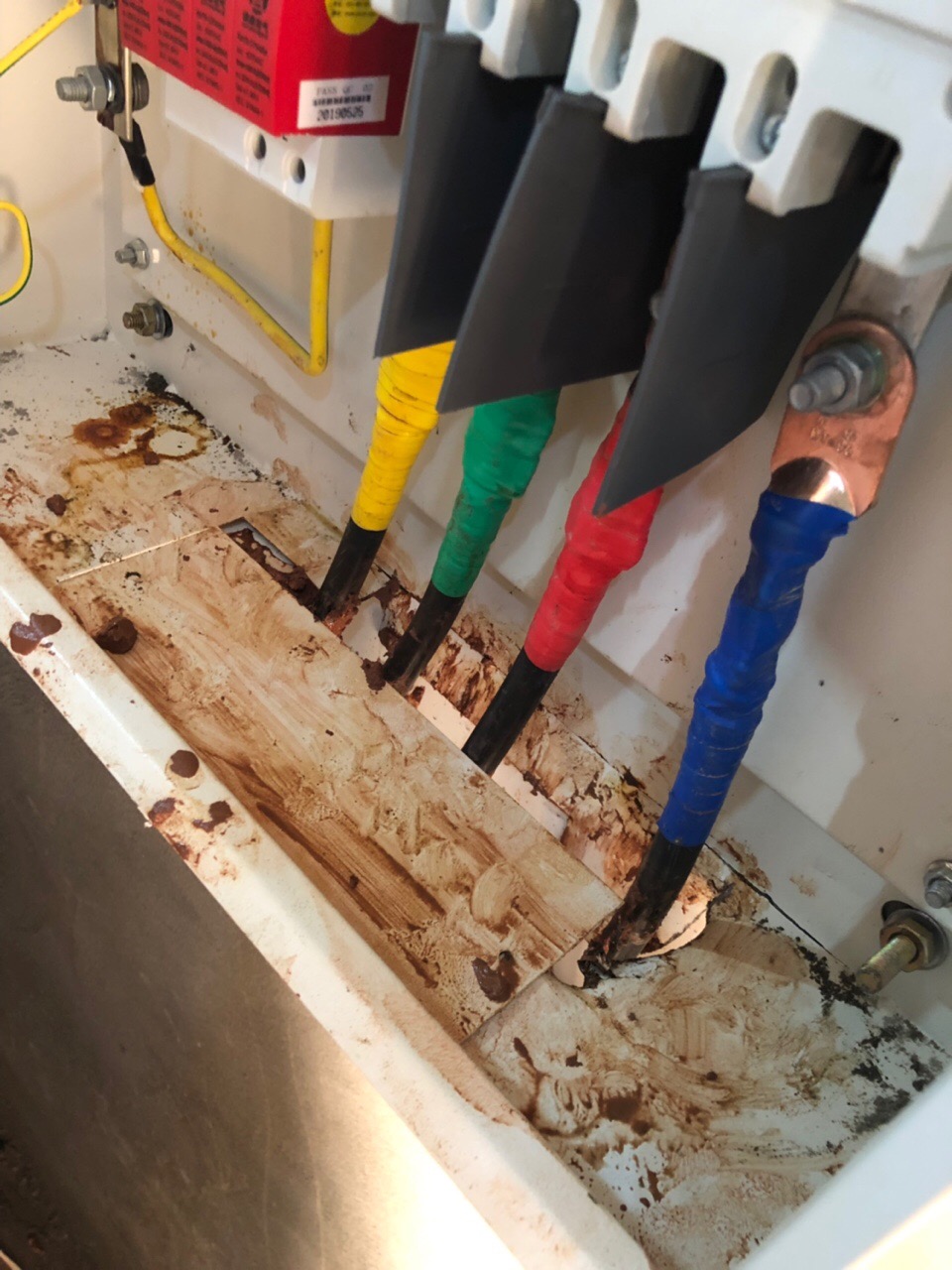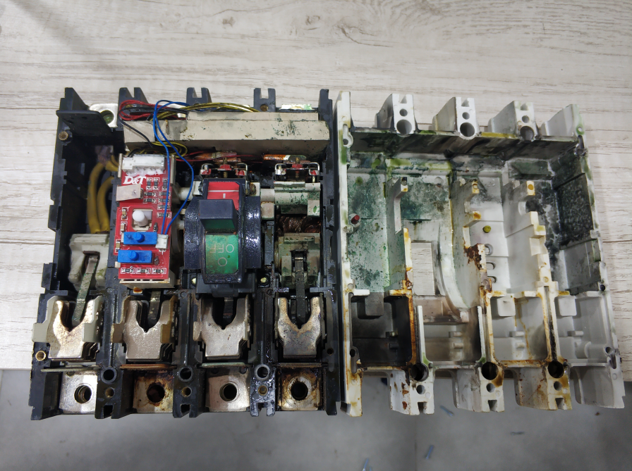 因開發(fā)商未及時處理地面水漬,高溫天氣產生水蒸氣,水蒸氣至樓層頂部時產生凝露,水滴落至開關內部造成相對地,和相間短路造成開關損壞。再次,頻繁跳閘原因是,因水漬進入開關內部,開關保護回路電路板損壞,導致漏電保護功能動作,頻繁跳閘。