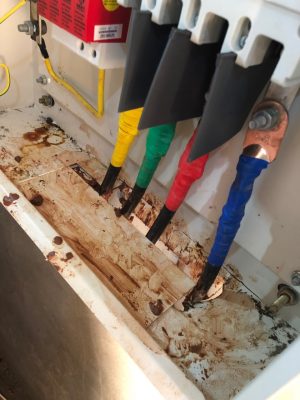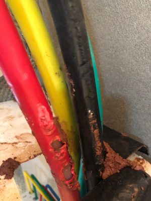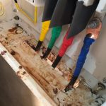 故障原因:因開發(fā)商未及時處理地面水漬,高溫天氣產生水蒸氣,水蒸氣至樓層頂部時產生凝露,水滴落至開關內部造成相對地,和相間短路造成開關損壞。再次,頻繁跳閘原因是,因水漬進入開關內部,開關保護回路電路板損壞,導致漏電保護功能動作,頻繁跳閘。