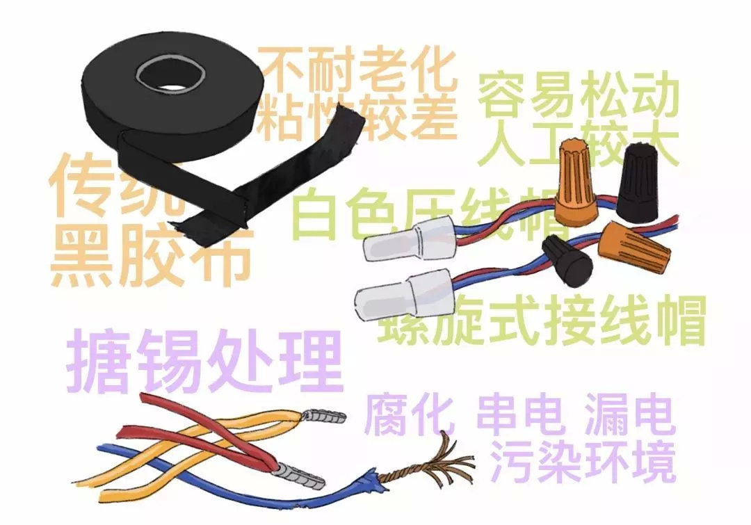 如果沒(méi)有一款先進(jìn)產(chǎn)品,那還要延續(xù)這種傳統(tǒng)的接線方式:黑膠布、白色壓線帽、螺絲釘連接、搪錫處理等。