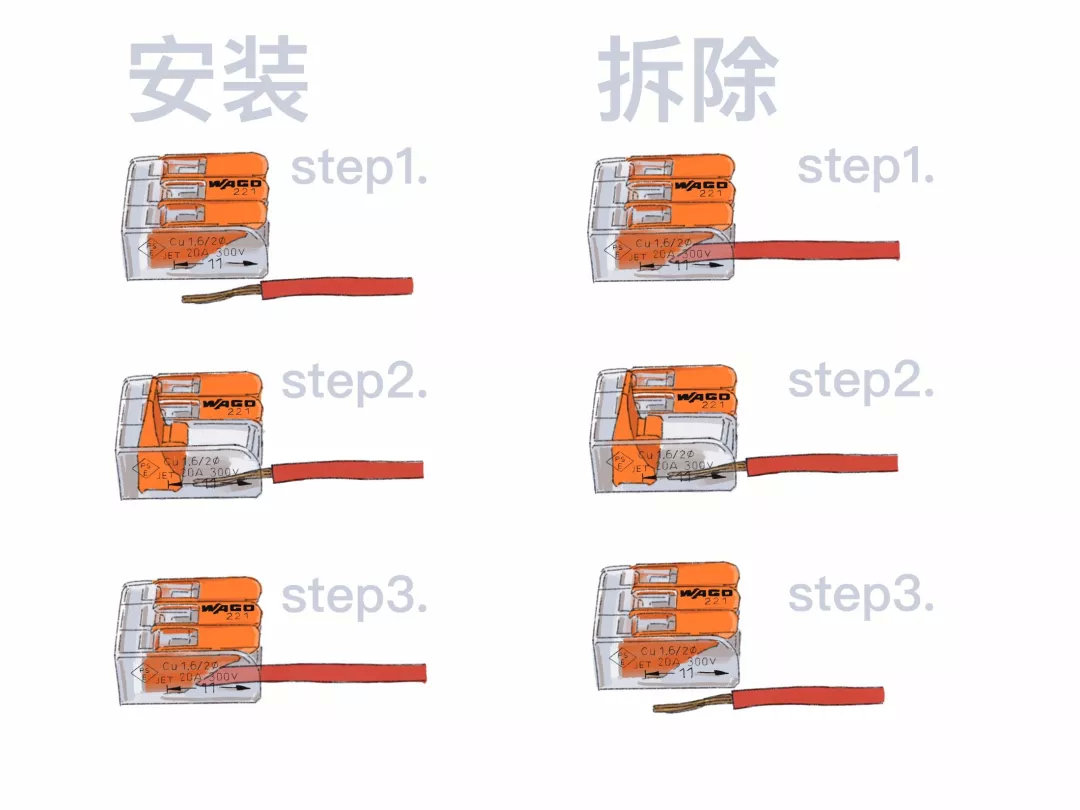 以接線盒內(nèi)連接單股電線為例,只需按產(chǎn)品側(cè)面所示剝線長(zhǎng)度,將電線外皮剝?nèi)?1mm(221系列4mm2產(chǎn)品),扳動(dòng)上方橙色手柄至90°位置,直接插入電線,將手柄扳回原位,完成接線,代替?zhèn)鹘y(tǒng)包布,布線整齊、安全、快捷。