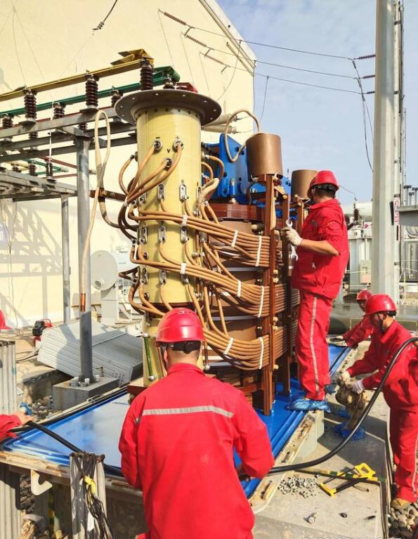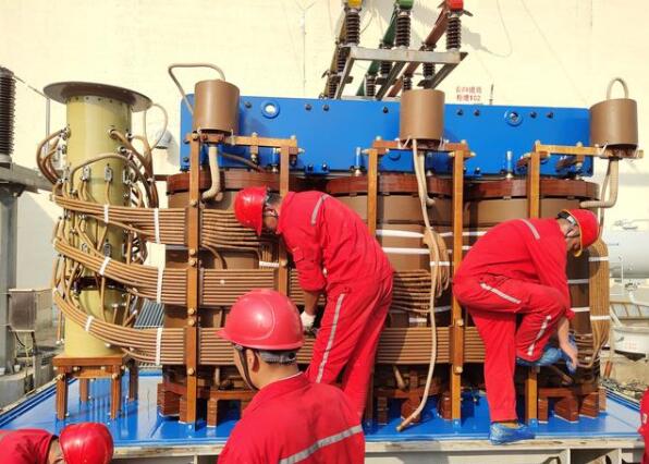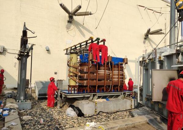 9、110kV變壓器大修吊芯作業(yè),大罩已經(jīng)取掉,工人們穿好專用鞋套,工作服,手套,進(jìn)行絕緣屏障,變壓器高低繞組,鐵芯等的檢查,緊固螺絲、更換密封膠條、膠墊等