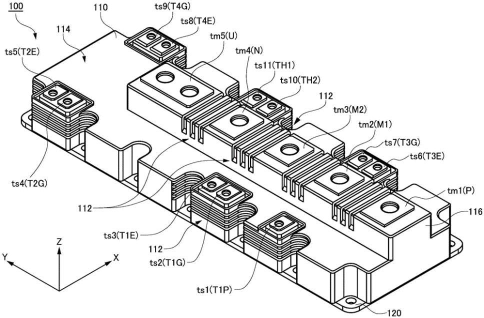 3個以上的導通部可以均具備:第1晶體管,其集電極端子與p端子連接;第2晶體管,其發(fā)射極端子與n端子連接;第3晶體管,其與第1晶體管串聯(lián)連接;第4晶體管,其與第3晶體管和第2晶體管串聯(lián)連接;以及2個二極管,其串聯(lián)地設(shè)置于第3晶體管的集電極端子與第4晶體管的發(fā)射極端子之間。第3晶體管的發(fā)射極端子與第4晶體管的集電極端子的連接點可以連接于u端子。2個二極管之間的連接點可以連接于m端子。