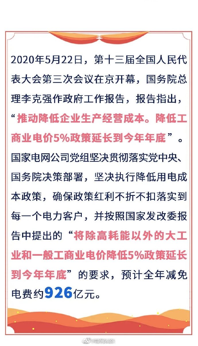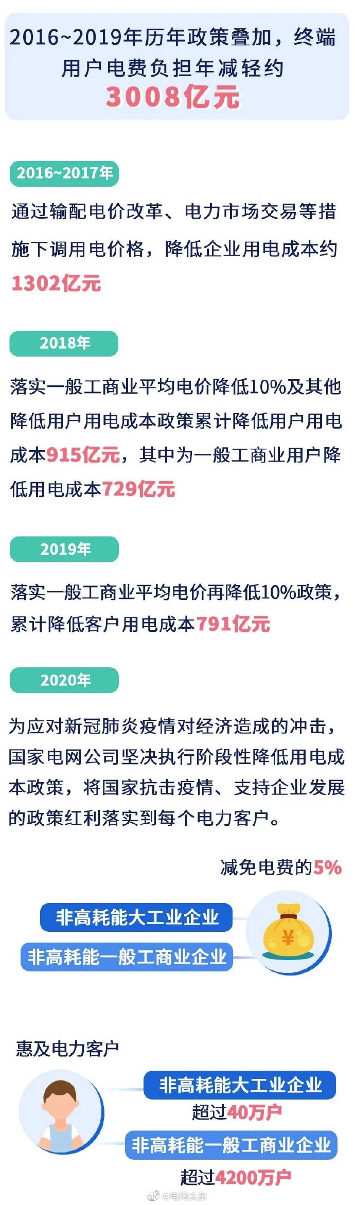 2016~2019年歷年政策疊加,國(guó)家電網(wǎng)經(jīng)營(yíng)區(qū)終端用戶(hù)電費(fèi)負(fù)擔(dān)年減輕約3008億元。2020年,為應(yīng)對(duì)新冠肺炎疫情對(duì)經(jīng)濟(jì)造成的沖擊,國(guó)家電網(wǎng)公司堅(jiān)決執(zhí)行階段性降低用電成本政策,預(yù)計(jì)全年減免電費(fèi)約926億元。 ????
