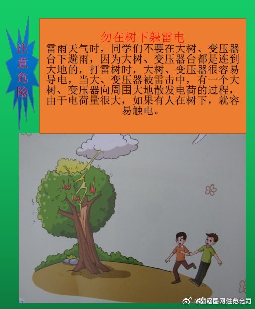 雷雨天氣時,不要在大樹、變壓器臺下避雨,因為大樹、變壓器臺都是連到大地的,打雷時,大樹、變壓器很容易導電,當大樹、變壓器被雷擊中,有一個大樹、變壓器向周圍大地散發(fā)電荷的過程,由于電荷量很大,如果有人在樹下,就容易觸電。切記勿在樹下躲雷電危險。