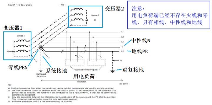 圖中就是兩臺電力變壓器的連接方案。注意到它們的PEN接地情況,以及分開為PE和N的情況。