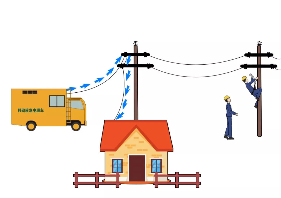 當(dāng)小e家的電源A線路需要停電檢修,卻還沒(méi)有實(shí)現(xiàn)“手拉手”供電時(shí),一輛移動(dòng)電源車(chē)會(huì)開(kāi)到附近,臨時(shí)充當(dāng)“B線路”角色為小e的家供電。