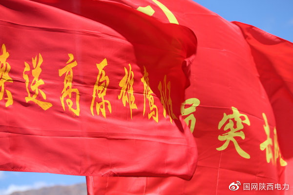 陜西送變電現(xiàn)場向黨員突擊隊授旗:攻堅克難,不辱使命。向青年突擊隊授旗:黨員引領(lǐng),齊頭并進(jìn)。洛桑達(dá)娃向堅守在高原的施工班組授受“陜送高原雄鷹班”的旗幟:陜送雄鷹,高原展翅。