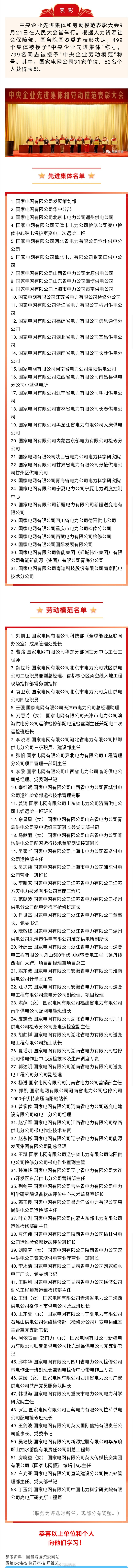 【人社部、國資委表彰國家電網(wǎng)這些集體和個人】中央企業(yè)先進集體和勞動模范表彰大會9月21日在人民大會堂舉行。根據(jù)人社部、國資委的表彰決定,499個集體被授予“中央企業(yè)先進集體”稱號,799名同志被授予“中央企業(yè)勞動模范”稱號。其中,國家電網(wǎng)公司31家單位、53名個人獲得表彰。
