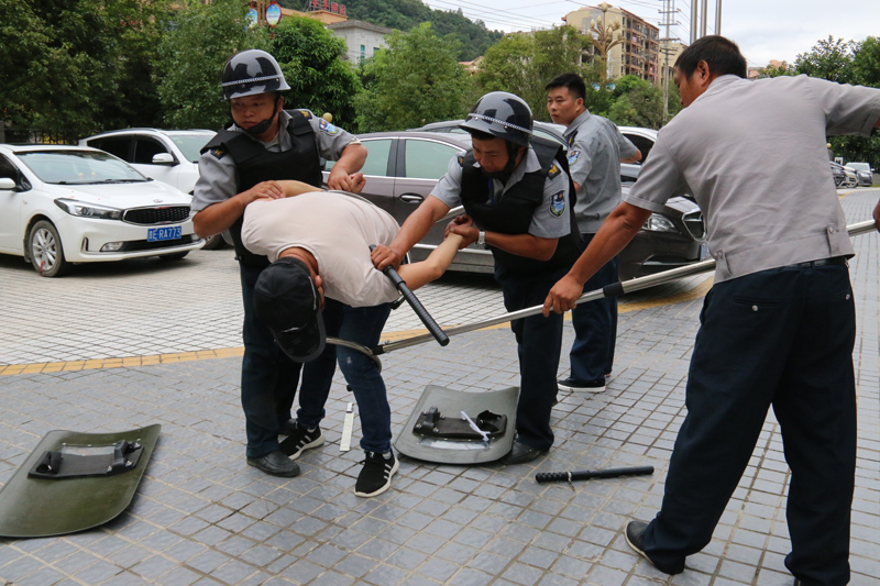 9月18日上午11時許,“突發(fā)性恐怖襲擊”演練正式開始。按照預設情景,三名來勢洶洶的“歹徒”手持刀具、燃燒瓶,強行沖進生產調度綜合樓準備實施破壞,襲擊保安和工作人員。大樓保安人員快速反應,迅速啟動應急預案,應急分隊成員手持警棍、鋼叉與暴恐分子周旋、搏斗,尋找適當機會制服暴恐分子。最終通過團隊協(xié)作成功將“歹徒”制服。