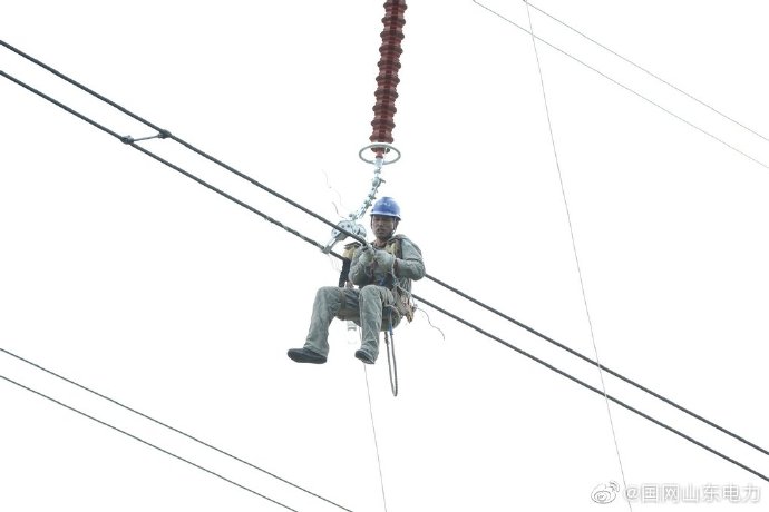 10月29日,在山東威海文登區(qū)九里水頭附近,國網(wǎng)威海供電公司輸電運檢人員高空作業(yè),對220千伏昆文線77號塔至78號塔之間破股導線進行修復,保障重要輸電通道安全,220千伏昆文線是220千伏文登站送入線路,為文登東部工業(yè)區(qū)提供可靠的電力支撐。 ????