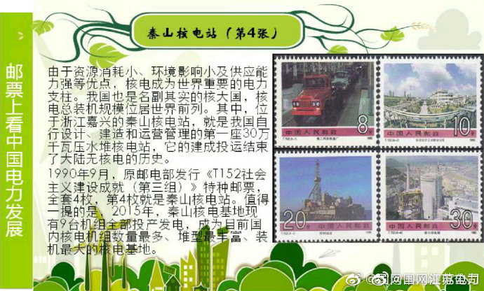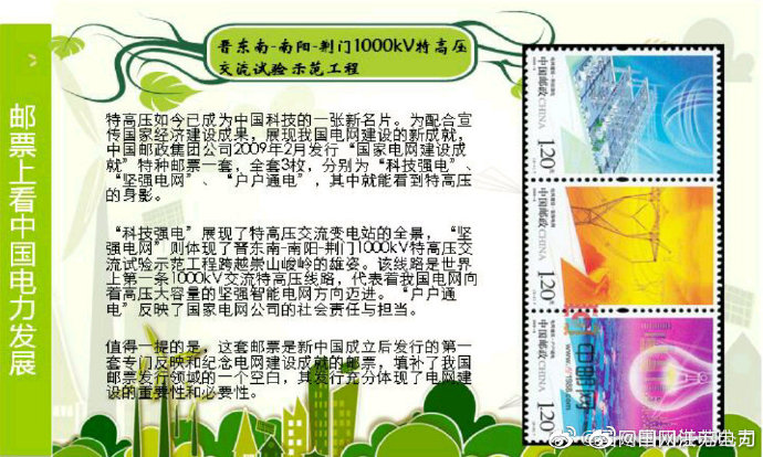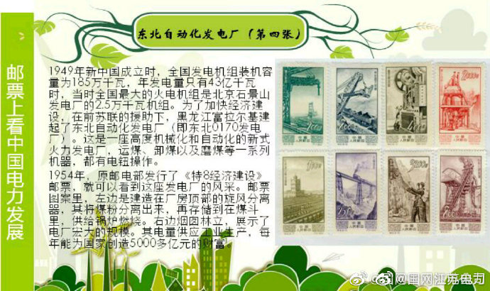 郵票,作為一種郵資憑證,其精美的圖案,還時常體現(xiàn)一個國家或地區(qū)的文化、歷史、經濟、風土人情、自然風貌等。在郵票上我們還能看到新中國的火電、風電、核電以及輸配電等電力工業(yè)也發(fā)展迅速,反映的是我國經濟發(fā)展的蒸蒸日上以及人民生活水平的不斷提高。