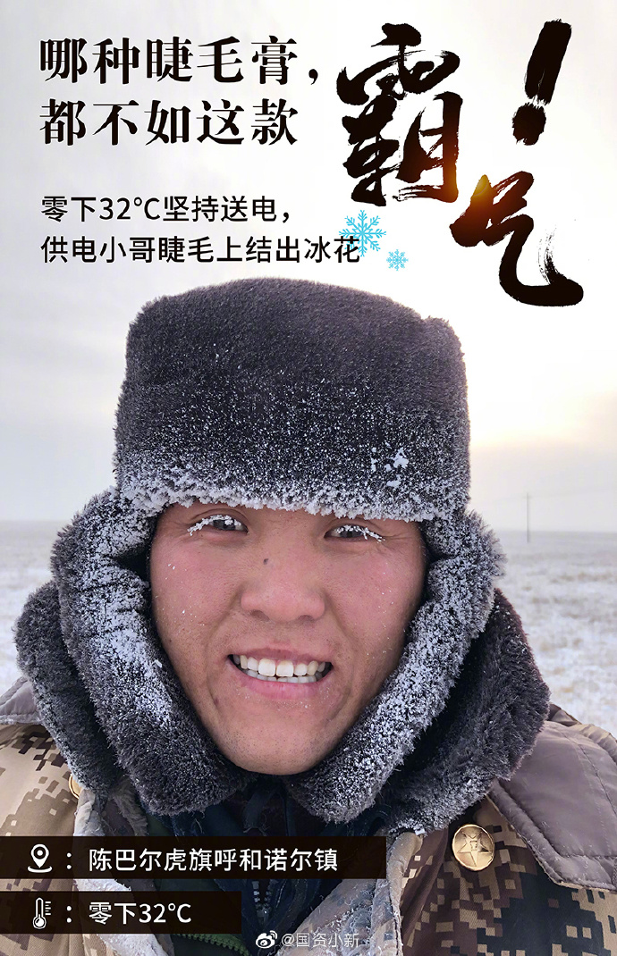 【哪種睫毛膏,都不如這款霸氣!】冬季,蒙東陳巴爾虎旗呼和諾爾鎮(zhèn)氣溫極低,是防寒保暖用電高峰。2019年12月29日,室外零下32攝氏度,寒風(fēng)凜冽,為了能給牧民及時(shí)送上電,供電員工爬上被積雪覆蓋的電桿,一干就是兩個(gè)小時(shí)。從電桿上下來(lái)時(shí),供電小哥的帽子、眉毛上都結(jié)了冰花。向寒冬中的工作者致敬,你們辛苦了!