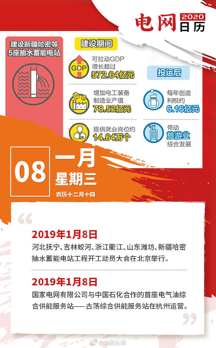 2019年1月8日,河北撫寧、吉林蛟河、浙江衢江、山東濰坊、新疆哈密抽水蓄能電站工程開工動員大會在北京舉行。2019年1月8日,國家電網(wǎng)有限公司與中國石化合作的首座電氣油綜合供能服務(wù)站——古蕩綜合供能服務(wù)站在杭州運營。 ????