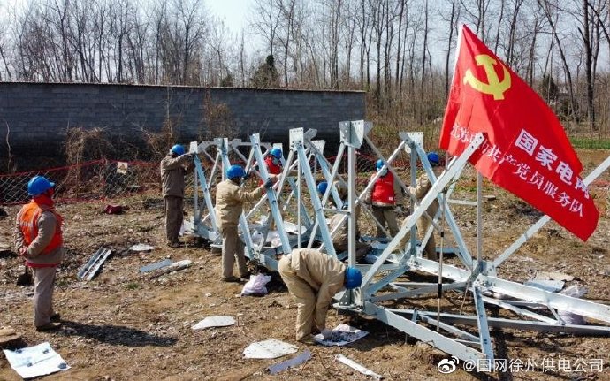【加快35千伏艾柳線鐵塔組立“戰(zhàn)疫”】3月5日,國網(wǎng)江蘇省電力公司邳州市供電公司工程公司黨員突擊隊(duì)員李勇、張同軍和工友們?cè)谧龊冒踩a(chǎn)和疫情防控的措施下在35千伏艾柳線組立16號(hào)鐵塔。