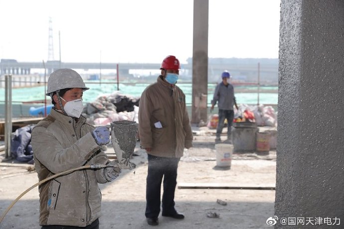 3月18日,天津送變電公司員工李學(xué)軍監(jiān)護(hù)施工人員為會(huì)展中心220千伏變電站結(jié)構(gòu)主體噴涂防火涂料。 ????