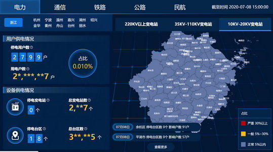 7月8日,國(guó)網(wǎng)浙江信通公司打造的數(shù)據(jù)產(chǎn)品“電力災(zāi)害數(shù)據(jù)指南針”已上線試運(yùn)行一周,有效助力浙江省政府及國(guó)網(wǎng)浙江電力防汛抗臺(tái)工作。該數(shù)據(jù)產(chǎn)品能從省、市、縣三級(jí)展現(xiàn)災(zāi)害區(qū)域內(nèi)客戶、企業(yè)、臺(tái)區(qū)及變電站的影響情況,直觀展現(xiàn)停電數(shù)、累計(jì)停電數(shù)、累計(jì)復(fù)電數(shù)、累計(jì)停電比例和累計(jì)復(fù)電比例等指標(biāo)的實(shí)時(shí)數(shù)據(jù)及趨勢(shì)變化情況,指標(biāo)數(shù)據(jù)每小時(shí)更新一次。災(zāi)害數(shù)據(jù)指南針?biāo)鶚?gòu)建的數(shù)據(jù)服務(wù)通過(guò)政企服務(wù)平臺(tái)及政務(wù)專線送至政務(wù)網(wǎng),幫助浙江省政府第一時(shí)間掌握受災(zāi)地區(qū)電力中斷及恢復(fù)情況,助力政府打造全方位的應(yīng)急防護(hù)指揮體系。