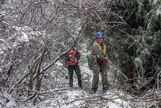 【海拔1800米 10年的風雪“約定”】7日清晨,寒風刺骨。簡短的班前會后,國網(wǎng)重慶涪陵電力公司輸電運檢一班黃勝一行4人整理好工具,踏上了巡線之路,這是他們前往武陵山區(qū)海拔1800多米的110千伏濤中線巡線的第10個年頭。110千伏濤中線連接涪陵白濤變電站和武隆中堡灣變電站,是貴州小水電上網(wǎng)的主干線之一。其中,20號桿至40號桿常常是降雪影響的地區(qū),33號桿海拔1860米,是海拔最高、受降雪影響最大的電線桿,也是巡線工人主要的巡察點?!澳銈冏呗c兒,我來把樹枝清理一下?!?3號桿周圍溝壑縱橫、林深草密,道路兩邊的灌木、竹林等被壓彎壓垮,完全封死了前進的道路,走不上去,只能靠爬,平日里只需40分鐘的路程在雨雪天氣下要耗時2個小時,到達33號桿時,巡線工人的鞋子與褲腳早已被雪水浸透?!岸久坑瞿齼?,電力線路常常覆冰。12月開始到次年2月我們都要進行防覆冰巡視,遇上惡劣天氣,每天都要上山巡檢,主要查看線路結冰情況、桿塔是否有裂紋、拉線是否松動等,如果覆冰樹竹倒伏在線路上要及時組織清砍?!秉S勝說。對于這些線路和桿塔,每一位巡線員都傾注了很深的感情?!拔覀兿窈亲o孩子一樣呵護著它們,只要電網(wǎng)能安全穩(wěn)定運行,我們就心安了?!?/p>