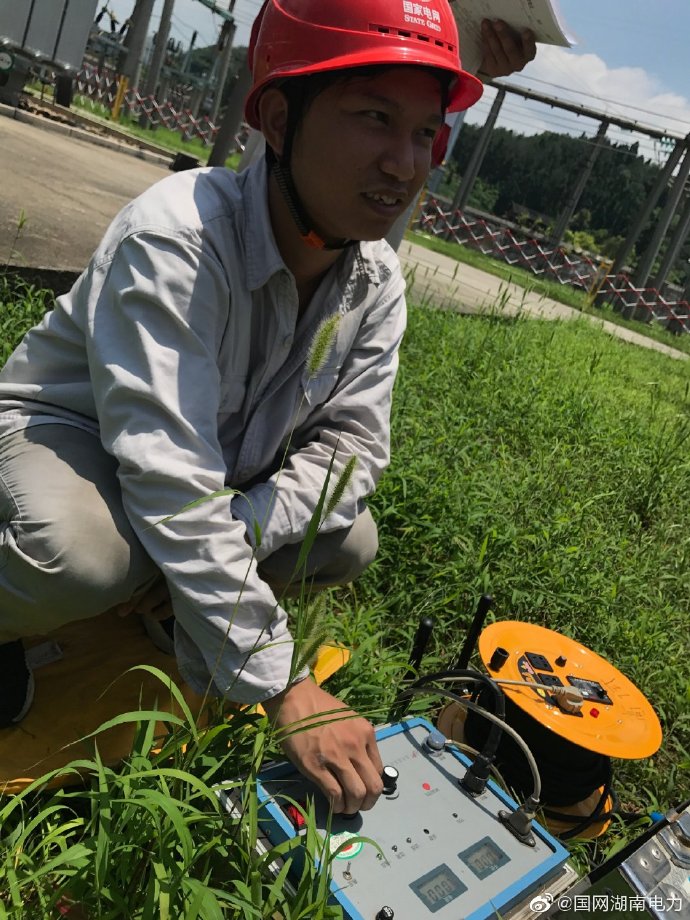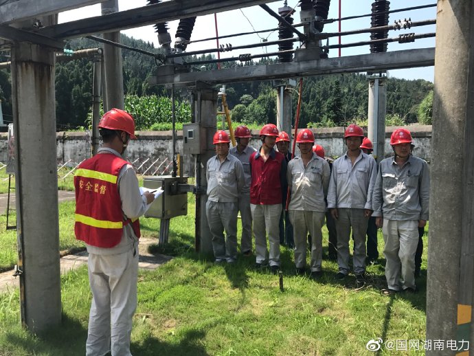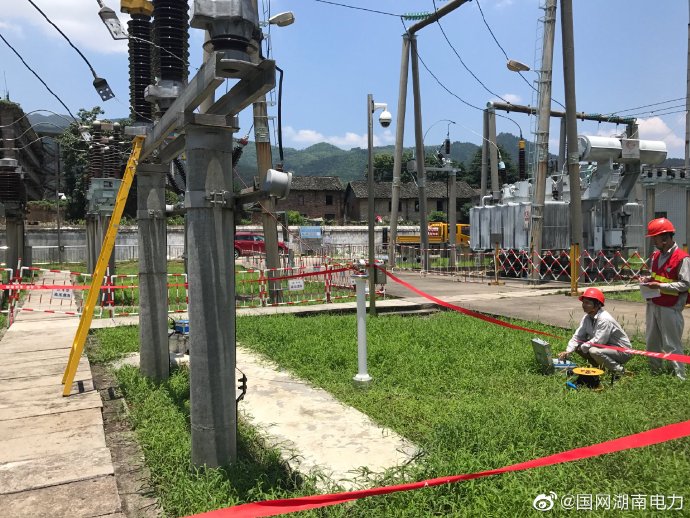 6月14日,國網(wǎng)邵陽檢修公司對110kV六都寨變進(jìn)行整站檢修工作。烈日灼空,班組人員正忙著對避雷器進(jìn)行泄露電流試驗,確保設(shè)備“體檢”到位。(劉波)國網(wǎng)邵陽供電公司