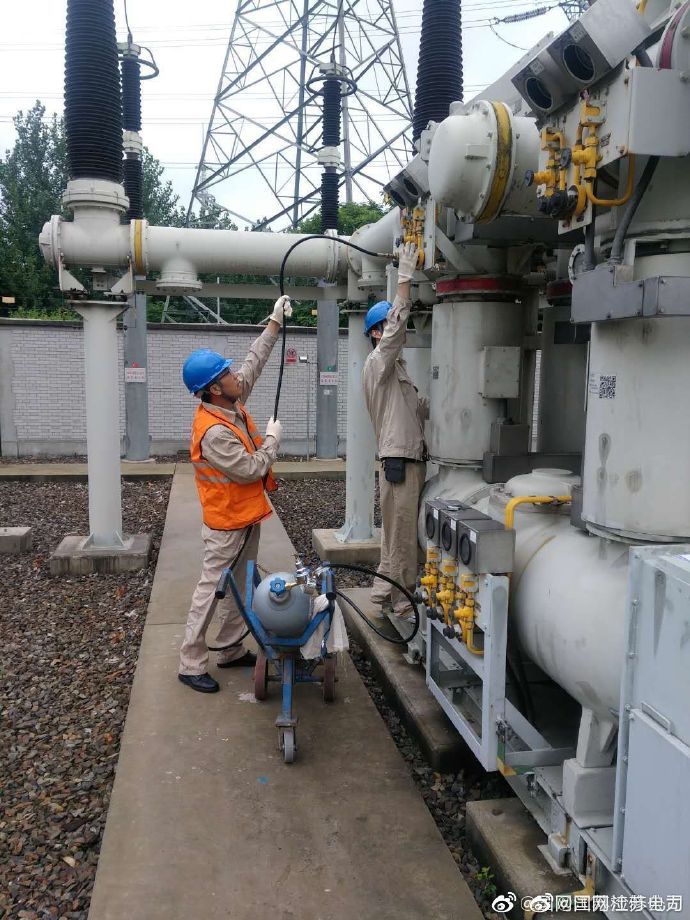 6月23日,國網(wǎng)江蘇檢修公司無錫運維站修試人員在500千伏惠泉變對SF6氣壓偏低的GIS氣室進行補氣工作。為確保供電設(shè)備在高溫高負荷下安全穩(wěn)定運行,工作人員加強對所轄變電站的檢修巡視工作,及時發(fā)現(xiàn)并處理隱患,確保迎峰度夏工作順利開展。 ????