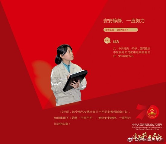 劉方,電力專業(yè)女博士,國網(wǎng)重慶市區(qū)供電公司配電運檢室主持工作的副主任和主持黨務(wù)工作的黨支部副書記——重慶市“五一勞動獎?wù)隆鲍@得者,國家電網(wǎng)公司勞動模范、劉方勞模工作室領(lǐng)軍人物。從調(diào)控中心到運維檢修部、發(fā)展策劃部,到再回配電運檢室。12年間,劉方在三個不同業(yè)務(wù)領(lǐng)域奮斗過,她帶領(lǐng)團隊在三個月內(nèi)完成了總計60多個變電站的整合調(diào)試,參與推動了來福士廣場的朝天門變電站聯(lián)建實現(xiàn)政府、企業(yè)、居民的三贏,在工作中她給同事留下始終“不慌不忙”、始終安安靜靜、一直努力沉淀的印象。因為專業(yè),所以專注;因為專注,所以安靜,芳華自開。