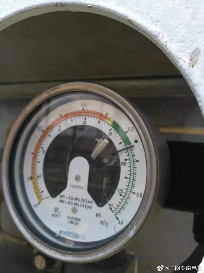 7月25日上午,變電運維一班人員到達220kV青山變電站進行全面巡視,發(fā)現(xiàn)1號主變510斷路器六氟化硫壓力已降至告警值,立刻聯(lián)系檢修人員及相關人員進行處理,成功避免了因壓力降低引起的電力事故發(fā)生。圖一為巡視發(fā)現(xiàn)的缺陷,圖二為處理后壓力表。