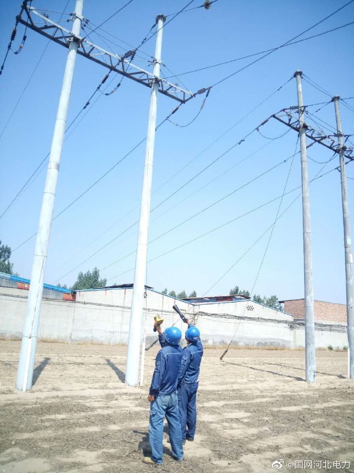 我們?nèi)蔽溲b,踏上這沒有硝煙的戰(zhàn)場,我們把激情唱響,辛勤的節(jié)奏多高亢,炎炎烈日也無法阻擋。圖為7月28日,國網(wǎng)安平縣供電公司員工為保障電網(wǎng)安全迎峰度夏,對(duì)重要輸電線路進(jìn)行遠(yuǎn)紅外測溫和局放檢測。