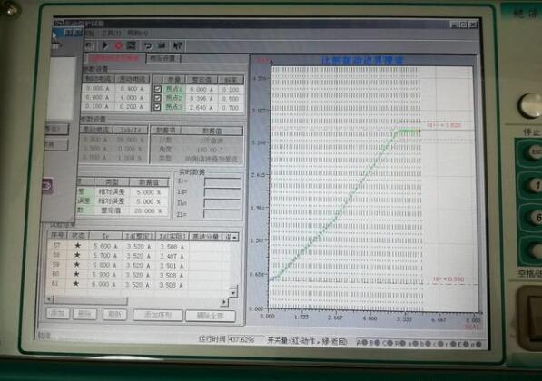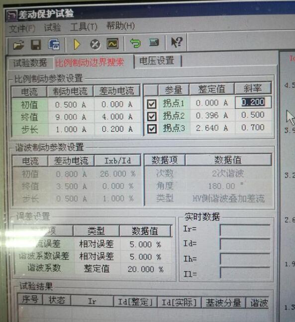 點(diǎn)擊“開(kāi)始按鈕”按鈕,繼保測(cè)試儀便能自動(dòng)尋找出Icd0、Isd、Izd0、K等比率制動(dòng)特性數(shù)值,并描出比率制動(dòng)特性曲線圖。這個(gè)曲線若在繼電保護(hù)測(cè)試儀自動(dòng)生成標(biāo)準(zhǔn)的比率制動(dòng)曲線的誤差范圍內(nèi),則此次試驗(yàn)結(jié)果合格,若在誤差范圍外,則需重新調(diào)整掃描精度,重新測(cè)試,直到結(jié)果合格為止。