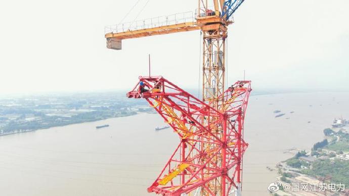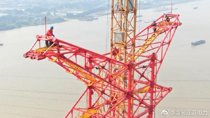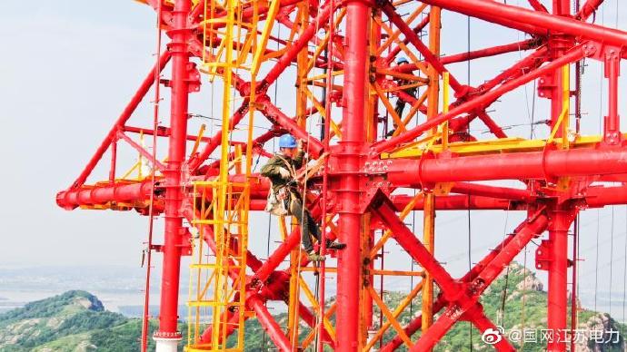 6月24日,在鎮(zhèn)江五峰山220千伏跨江升高改造工程南跨越塔舊塔爆破原址,江蘇省送變電有限公司施工人員正在162米的高空組裝新鐵塔。隨著最后一吊地線頂架完成組裝,標(biāo)志著南跨越塔全部組裝完成。新建跨江輸電線路建設(shè)后將滿足現(xiàn)今長(zhǎng)江干線5萬(wàn)噸級(jí)海輪遠(yuǎn)航凈高50米的要求,輸電能力也較原來(lái)提升3倍以上。